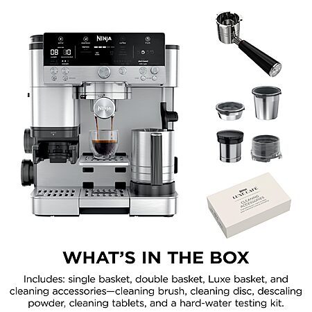 • WHAT'S INCLUDED: Portafilter, Milk Jug, Double Basket, Luxe Basket, Assisted Tamper, Cleaning Brush, Cleaning Disc, Funnel, Descaling Powder, Cleaning tablets, Hard Water Testing Kit, Instructions & Inspiration Guide.