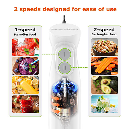 | Product Description: | Bonsenkitchen 2-Speed Hand Blender,Handheld Blender with stainless steel upgraded blades for soup, smoothie, puree, baby food. Bonsenkitchen's immersion blender features a 300w motor, its sharp stainless steel blades and multiple speed settings for wonderfully smooth results in seconds. Meanwhile, the ergonomic handle design of this handheld blender makes it easy to hold and maneuver. The blender can be used in any container such as 400ml, 700ml, etc. The immersion hand blender is perfect for everyday kitchen use, and its compact shape allows it to be stored in a drawer or cabinet without taking up too much space. Ergonomic Immersion Hand Blender. Perfect for baby foods, soups, smoothies, Purée and more. Ergonomic handle support one-handed operation with ease and help you to make food preparation process faster and easier. Variable 2-Speed Control. Bonsenkitchen stick blender equipped with 2-Speed adjustable settings & turbo boost can quickly blends ingredients and meet various blending task with its stainless steel shaped blade. Save your time and energy. Ergonomic Immersion Hand Blender. Perfect for baby foods, soups, smoothies, Purée and more. Ergonomic handle support one-handed operation with ease and help you to make food preparation process faster and easier. Variable 2-Speed Control. Bonsenkitchen stick blender equipped with 2-Speed adjustable settings & turbo boost can quickly blends ingredients and meet various blending task with its stainless steel shaped blade. Save your time and energy. Solid Internal Structure & Enhanced Blending Blade. The kitchen hand blender built in full copper motor, which has much better heat dissipation than ordinary motors and has a life span of 200% longer than other motors. Semi-wrapped stainless steel blade guard designed preventing splashing and keeping food from getting stuck. Easy To Use & Dishwasher Safe. The stick blender is detachable and all parts are easy to assemble, just need to combinate the accessories with main body. Also, the detachable parts are dishwasher safe for easy cleaning. But don't immerse the motor part of the blender into water Solid Internal Structure & Enhanced Blending Blade. The kitchen hand blender built in full copper motor, which has much better heat dissipation than ordinary motors and has a life span of 200% longer than other motors. Semi-wrapped stainless steel blade guard designed preventing splashing and keeping food from getting stuck. Easy To Use & Dishwasher Safe. The stick blender is detachable and all parts are easy to assemble, just need to combinate the accessories with main body. Also, the detachable parts are dishwasher safe for easy cleaning. But don't immerse the motor part of the blender into water Quality Guarantee. 1 year warranty & lifetime technical support. No toxic chemicals will be released during food processing with our BPA free containers. This multifunctional hand blender is a durable and practical kitchen accessories, the best choice for gifting friends or family. Quality Guarantee. 1 year warranty & lifetime technical support. No toxic chemicals will be released during food processing with our BPA free containers. This multifunctional hand blender is a durable and practical kitchen accessories, the best choice for gifting friends or family. |