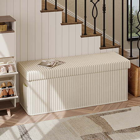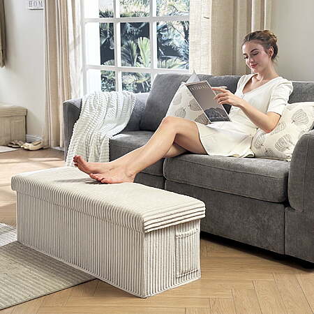 Model: Pinmoco 43" Folding Storage Ottoman Bench with Side Pocket, Corduroy Storage Bench Entryway Bench for Bedroom, Living Room, Beige