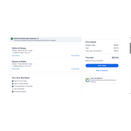 JetBlue and Expedia have round trip airfares travelling from Dallas (DFW) to Nassau Bahamas (NAS) for $314, making 1 stop in Ft Lauderdale for several hours so plan ahead. These are basic economy fares that allow a personal item and a carry-on bag. There is no seat selection and no change.