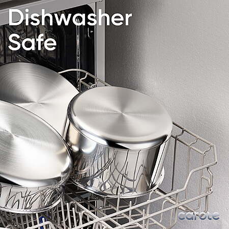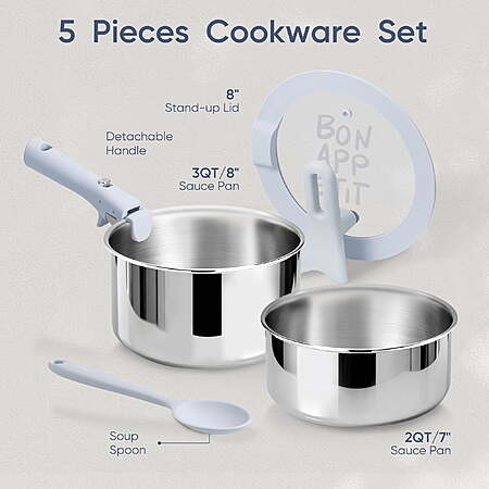 | Product Description: | Enhance your cooking routine with this 5-Piece Tri-Ply Stainless Steel Saucepan Set, crafted for everyday convenience and healthy performance. Built with durable, non-coated stainless steel, it supports safe cooking with no chemical coatings. The tri-ply structure delivers rapid, even heating for simmering, boiling, reheating, or making sauces. A detachable handle offers flexible use and compact storage, while the stand-up lid and stackable design keep your kitchen organized. Compatible with all stovetops, including induction, each pan becomes oven-safe when the handle is removed. Dishwasher-safe construction ensures quick and effortless cleanup after every meal. Check out more Carote Cookware Products at https://www.walmart.com/browse/home/carote/4044_623679_8140341_2359044 Care & Use Tips: 1. Avoid preheating an empty pan; use medium to low heat during cooking. 2. Preheat with a small amount of oil for 30–60 seconds before adding food to reduce sticking and improve browning. 3. Use wooden, silicone, or nylon utensils to protect the pan surface and maintain its appearance and heat conductivity. 4. Always ensure the detachable handle is firmly attached before use. Saucepan Set for Daily Use: Includes 2 sauce pans(2QT & 3QT), an 8" stand-up lid, a detachable handle, and a spoon. Ideal for boiling, simmering, reheating, or making sauces in a small pot whether cooking at home, traveling, or camping outdoors. Tri-Ply Stainless Steel Construction:Each sauce pot features a three-layer stainless steel structure that heats evenly and resists warping. Suitable for gas, electric, induction, and ceramic cooktops, it provides reliable performance for daily cooking tasks. Detachable Handle for Flexible Cooking: The removable handle lets you switch pans easily and reduces storage space. Once removed, each tri-ply stainless steel saucepan becomes oven-safe, giving you more ways to bake, roast, or reheat meals in one compact set. Stand-Up Lid for Cleaner Counters: The stand-up saucepan with lid stays upright while cooking, preventing drips on your counter. It allows quick stirring, tasting, or adding ingredients without creating extra mess, making everyday cooking more convenient. Space-Saving Stackable Design: The 3QT and 2QT pans nest tightly for compact storage, ideal for apartments, RVs, dorms, and camping. This small pot set helps maximize cabinet space while keeping your cookware neatly organized and easy to access. Dishwasher-Safe for Easy Cleaning: Simply remove the handles, and the cookware is dishwasher-safe for quick and convenient cleanup. |