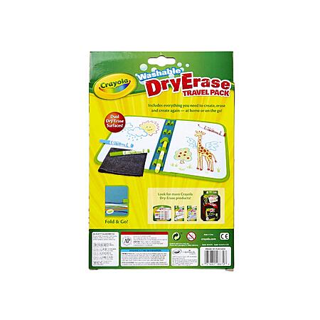 • Crayola Dry-Erase Travel Pack gives you two reusable drawing surfaces that fold up into one portable pack. Comes equipped with 4 Washable Dry-Erase Markers & an E-Z Erase Cloth.