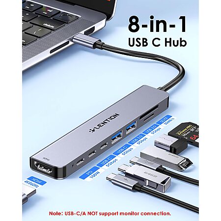 Lention via Amazon [amazon.com] has 8-in-1 LENTION USB C Hub Dock w/ 4K@60Hz HDMI Adapter, 2 USB-C & 2 USB 3.0 Port & 100W PD on sale for $21.99 - 50% off when you enter the coupon code 5W72934H = $10.99. Shipping is free w/ Prime or on $35+.