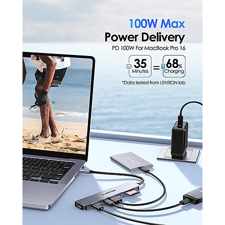 • 8-in-1 UCB C Hub Expansion: LENTION 8-in-1 USB C Multiple Hub features a 100W Type C charging port,a 4K@60Hz HDMI output port, 2 USB C Data & 2 USB 3.0 port in 5 Gpbs data transfer speed,SD/Micro SD 2.0 Card Reader can read up to 2TB memory cards.Noted: Not support Superdrive.