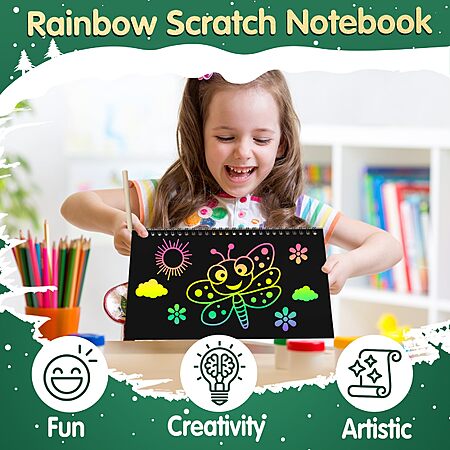 • Safe & Easy to Use: This magic scratch art notebook are made of safe and premium material, non-toxic powder and not easy to tear.The black scratch art paper notebook provide soft brush, it prevents the little hands from getting dirty and keep kids clothes clean. Girls and Boys can enjoy fun arts and crafts activities safely.