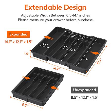 • Adjustable design fits drawers 8.5-14.1" wide