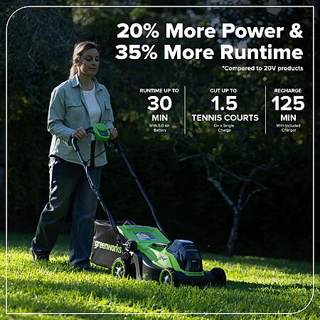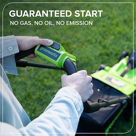 - Eco-Friendly & Maintenance-Free — Battery-powered mower starts instantly with no gas, oil, spark plugs or pull cords. Backed by Greenworks' 3-year warranty on both mower and battery