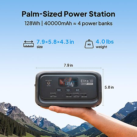 Bluetti via Amazon.com has BLUETTI Elite 10 Mini Portable Power Station, 128Wh LiFePO4 Battery with 200W AC Outlet, Flight-Approved Power Bank for Travel, Fast Recharge Solar Generator for Camping & Outage Emergency Backup on sale for $112.98.