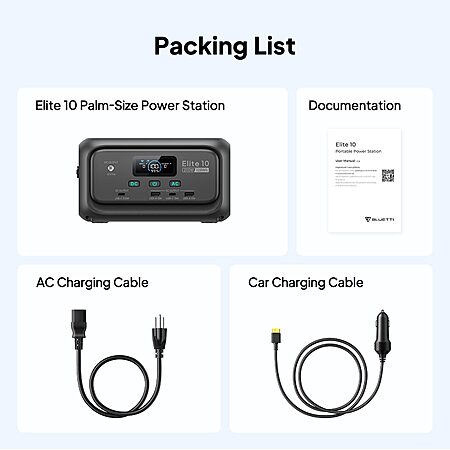 • [What You Get] - BLUETTI Elite 10 mini power station (7.87 × 5.75 × 4.33 in, only 3.97 lbs), AC charging cable, car charging cable, user manual.