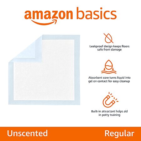 Model: Amazon Basics Dog and Puppy Pee Pads with Leak-Proof Quick-Dry Design for Potty Training, Standard Absorbency, Regular Size, 22 x 22 Inches, Pack of 100, Blue & White
