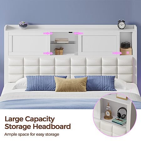 - Large Storage Space: Features a bookcase storage headboard with two sliding doors to hide clutter and a glass panel that creates two open shelves for easy access to essentials like magazines, phones, and alarm clocks.