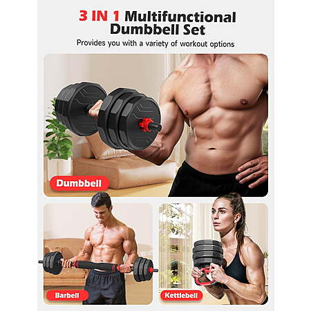 Upgo Fitness via Walmart[walmart.com] has Upgo 70-lbs Free Weight Set w/ Connector, 5 in1 Dumbbells Set (Barbell, Kettlebells, Push up Stand, Fitness Exercises for Home Gym) for $78.59. Shipping is free.