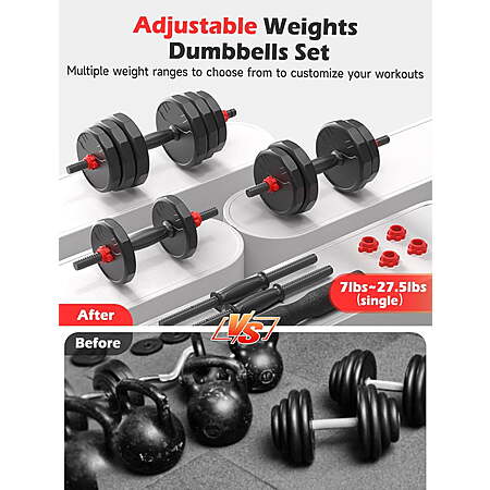 5-in-1 Multifunctional Dumbbell Set: The Adjustable Dumbbell Set combines dumbbells, barbells, and kettlebells into one versatile package. Maximum adjustable weight range of 70lbs, it's perfect for various fitness exercises, including bench presses and squats. Ideal for both home gyms and professional use. Premium Build Quality: This free weights dumbbell set features a durable exterior made of high-quality PE material mixed with iron, mud, and sand. This robust construction ensures longevity and prevents floor abrasion, making it a reliable choice for your workouts. Comfortable and Safe Design: The connecting rod of the barbell weight set is crafted from 5mm thick steel and 20mm thick high-quality foam. Its curved design comfortably fits the neck, offering non-slip and sweat-absorbing properties to ensure a safe and comfortable workout experience. High-Quality Safety Nuts: This adjustable dumbbell set includes four safety nuts. The thickened threads on the nuts effectively keep the weight plates secure, preventing movement or shaking during workouts. This ensures your safety and provides a stable exercise experience. Non-Slip Dumbbell Bars: The dumbbell bars are made from ABS environmentally friendly material and feature a non-slip texture, enhancing hand grip and control during workouts. This design helps you manage the dumbbells better, improving your exercise efficiency and safety. Quick and Easy Adjustments: This adjustable dumbbell set allows for quick and easy weight changes, with a single dumbbell's adjustable weight range from 9lbs to 45lbs. The detachable design makes weight adjustments simple, ensuring you can switch between different exercises seamlessly, from light workouts to intense training sessions. 12-Sided Anti-Slip Design: Unlike traditional round weight plates, our 12-sided anti-slip plates provide superior stability and prevent rolling, ensuring a safer workout. This unique design enhances your control during exercises, making it perfect for a variety of routines.