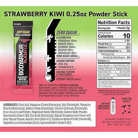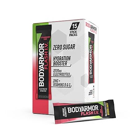 Model: BODYARMOR Flash IV Electrolyte Packets, Strawberry Kiwi - Zero Sugar Drink Mix, Single Serve Packs, Coconut Water Powder (15 Count)