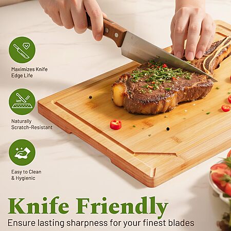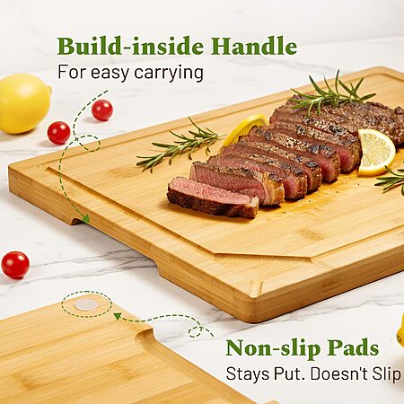Product Description from Amazon- NO-MESS JUICE GROOVE UPGRADED: Tired of juice spills after cutting meat or fruit? This bamboo cutting board features a groove with a low-profile spout. By the sink, no lifting, no tilting—juices drain automatically. Collect or discard, the choice is yours