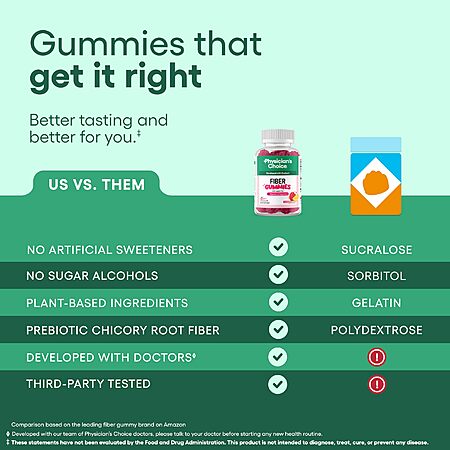 Model: Physicianโ€™s Choice Fiber Gummies for Digestive Health & Regularity - Raspberry Lemon Flavor - No Sugar Added & Vegan - Natural Chicory Root Prebiotic Fiber - Daily Gummy for Adults, Women & Men - 60CT