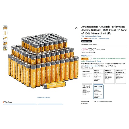 Amazon Basics AAA High-Performance Alkaline Batteries, 1000 Count (10 Packs of 100) 10-Year Shelf Life $144.54 w/coupon 30% on your first Subscribe & Save