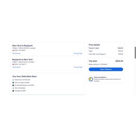 Delta Air Lines and Expedia have round trip airfares travelling from New York (JFK) to Iceland (KEF) for $435, nonstop These are main basic economy fares that allow a personal item and a carry-on bag. There is no seat selection and no change.