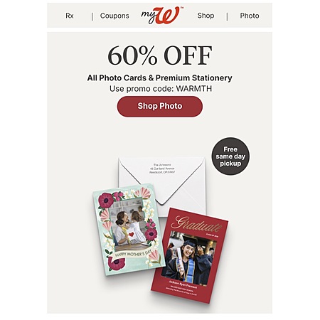 Must use code WARMTH to receive 60% off All Photo Cards and Premium Stationery through a logged in registered Walgreens.com/Photo online account, in store on photo kiosk or through the Walgreens Mobile App. Code must be entered at time of online, in store or mobile checkout to apply discount. Offer expires at 11:59 p.m. CT on April 18, 2026. Timing is determined by Walgreens server clock. Select products not available through the Walgreens Mobile App. If ordering more than one item, up to three coupons or strike through sale discounts can be used in the online cart. Only one coupon code or strike through sale pricing discount can be applied per item. Account product credits are applied first and cannot be combined with coupon codes or strike through sale pricing. Void if transferred, reproduced or copied and where prohibited by law. Discount does not apply to previous purchases, taxes or shipping charges. Offer is subject to change or cancellation at any time.