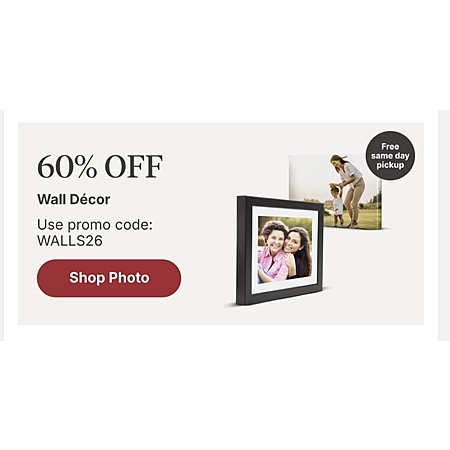 Must use code WALLS26 to receive 60% off Wall Decor through a logged in registered Walgreens.com/Photo online account, in store on the photo kiosk, or through the Walgreens Mobile App. Code must be entered at time of online, in-store photo kiosk, or mobile checkout to apply discount. Offer expires at 11:59 p.m. CT on April 18, 2026. Timing is determined by Walgreens server clock. Offer discount is limited to products under Canvas Prints, Canvas Art, Custom Floating Frames, Framed Matted Prints, Metal Panels, Posters, Banners, Wood Hanger Board Prints, TilePix, and Wood Panels only. Select products not available through the Walgreens Mobile App. If ordering more than one item, up to three coupons or strike through sale discounts can be used in the online cart. Only one coupon code or strike through sale pricing discount can be applied per item. Account product credits are applied first and cannot be combined with coupon codes or strike through sale pricing. Void if transferred, reproduced or copied and where prohibited by law. Discount does not apply to previous purchases, taxes or shipping charges. Offer is subject to change or cancellation at any time.
