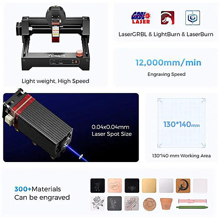 | Product Description: | High-Speed 2.5W Laser Engraving – Powered by a 32-bit motherboard with speeds up to 12000mm/min, 20% faster than similar models, ensuring smoother, more precise engraving and cutting.