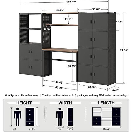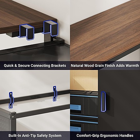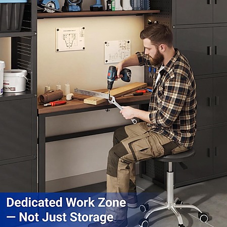 Product Description:- 3-in-1 Modular Design: Combines a spacious workbench, side cabinets, and pegboards into one space-saving system.