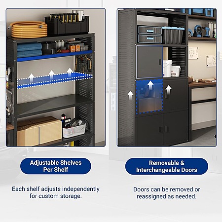 - Fully Adjustable Storage: Move shelves and reposition cabinet doors to fit items of any size and keep your space organized.