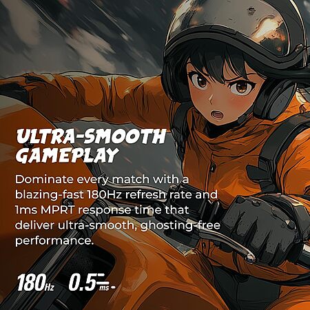 - 180Hz refresh rate (via DP1.4) and rapid 1ms MPRT response time lets you target moving opponents with precision, putting you ahead of the game. Fast-moving action and dramatic transitions will be rendered smoothly without the effects of ghosting with AMD FreeSync Premium technology.