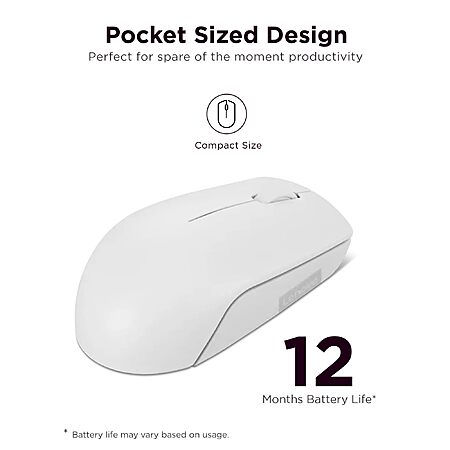 - Battery Life That Lasts: Bid farewell to battery concerns with the Lenovo 300 Wireless Compact Mouse. Equipped with a single AA battery, this powerhouse ensures a remarkable battery life of up to 12 months . Say goodbye to the hassle of frequent battery replacements and stay focused on what truly matters – your tasks, presentations, and projects.
