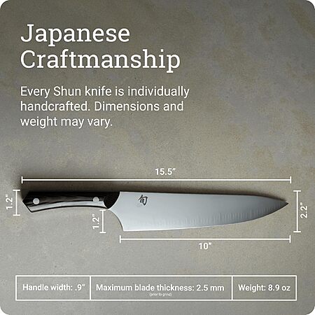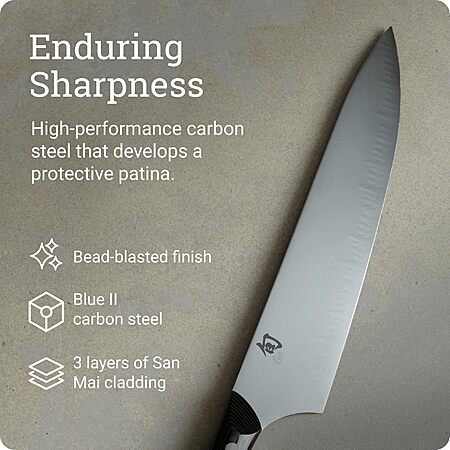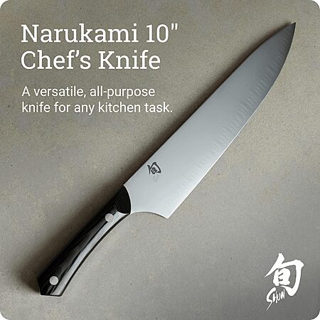 Shun Narukami 10" Chef's Knife [amazon.com], Handcrafted Japanese Kitchen Knife for Professional and Home Chefs, Blue II Carbon Steel Core and San Mai Stainless Steel Cladding, Micarta Handle $199.99