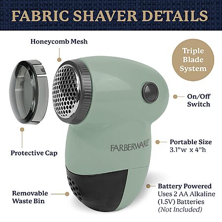 - RESTORE YOUR FAVORITES: The Farberware Fabric Shaver and Lint Remover refresh clothing, sweaters, and furniture; triple stainless blades remove fuzz, lint, and pills—reviving your wardrobe and upholstery instantly, ideal for pet owners.