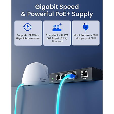 【PoE Performance】Features 4 downlink ports and 1 uplink port, all supporting 10/100/1000Mbps transmission speeds and compliant with IEEE 802.3af/at (PoE+). Provides stable power and fast data transfer for multiple PoE cameras, wireless access points, and other devices.