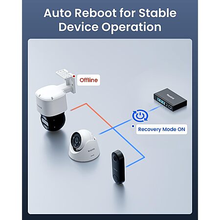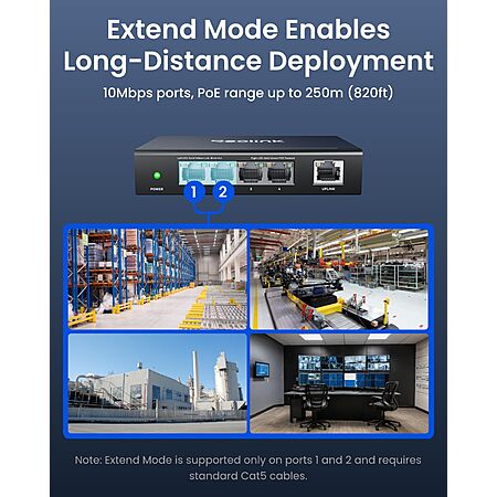 【Advanced Modes】Activate Extend Mode to set ports 1–2 to 10Mbps and extend PoE transmission distance up to 820 ft (250 meters)* — ideal for long cable runs. In Recovery Mode, the switch detects unresponsive PoE devices and reboots them automatically, minimizing manual maintenance. *Note: Extend Mode requires standard Cat5E or higher Ethernet cables.