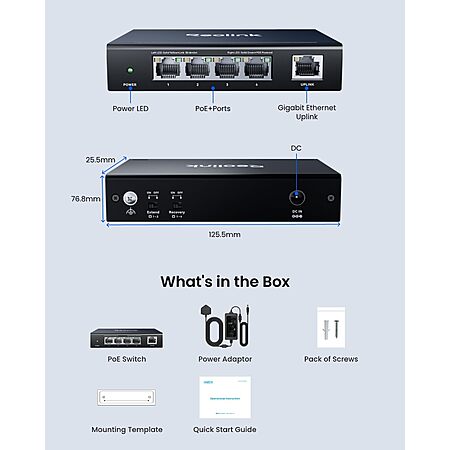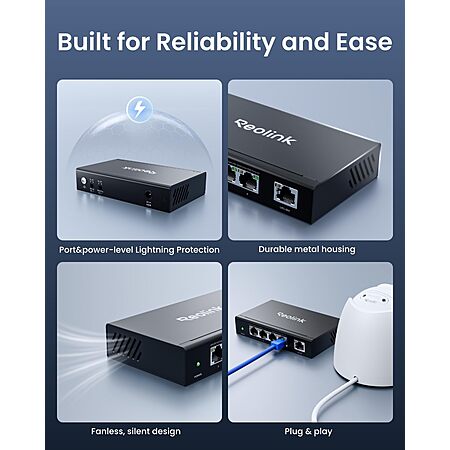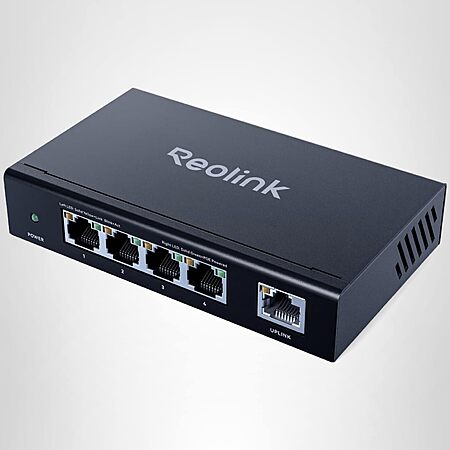 Reolink High Speed and Stability 4+1-Port PoE Switch for Home & Business, Compatible with REOLINK PoE Security Camera/NVR, Metal Housing, Wall/Desktop Mount, RLA-PS1E