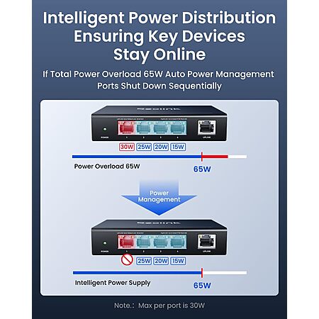 【Smart Power Management】Automatically detects whether connected devices require power and how much they consume. When total power usage exceeds 65W, the switch intelligently powers down ports in reverse order to maintain stability on priority devices.