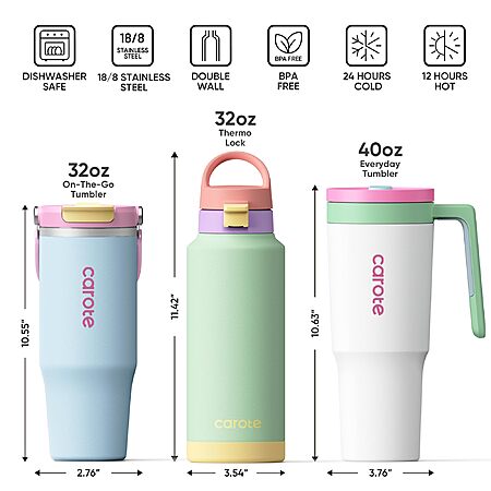 CAROTE 3-Pack Insulated Stainless Steel Water Bottles with Upgraded Leakproof Tech (Macaron) $25.98