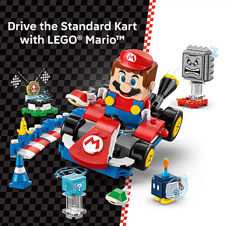• Race the Standard Kart with LEGO Mario, earn digital rewards from the Item Box, defeat the Bob-omb and Thwomp, see how LEGO Mario reacts to the green and red LEGO plates, and more
