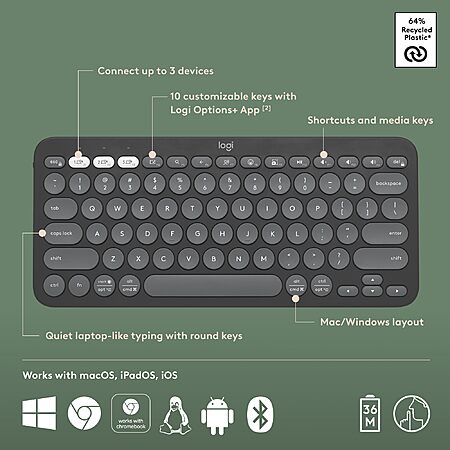 Logitech Pebble Keys 2 K380s, Multi-Device Bluetooth Wireless Keyboard with Customizable Shortcuts, Slim and Portable, Easy-Switch for Windows, macOS, iPadOS, Android, Chrome OS - Tonal Graphite $33.99