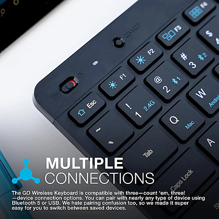 The GO Wireless Bluetooth Keyboard is small and mighty. Complete your minimalist work setup or pair up with a range of devices wherever you are. With up to three saved device connections and a sleek, low-profile design, this keyboard gives you style, functionality, and ultimate convenience on the GO.