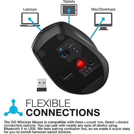 The GO Wireless Bluetooth Mouse is small, comfortable in your hand, and dare we say—kind of cute? Your everything go-to, it goes with you from desk to café to coworking space and beyond. We see you digital nomads. Three saved device connections means you can seamlessly switch connections as easily as you switch filters.