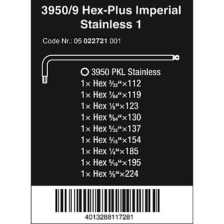 WERA Stainless Steel Imperial/SAE Hex Key Set w/Belt Pouch - 9 Pieces $43