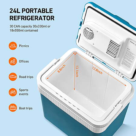 | Product Description: | Enjoy spacious storage for a more comfortable journey. Its portable design with an adapter makes it perfect for RV trips, road trips, camping, and outdoor adventures. Upgrade your travels today with the AstroAI camping refrigerator! Size Specifications: Outer Size: 15.3 inches(L) x 10.3 inches(W) x 16.7 inches (H) Interior Size: 12.8 inches(L) x 8.8 inches (W) x 13.1 inches(H) Converter Included For Convenient Use: This fridge works with both DC 12V and AC 110V power supplies using the included converter, allowing you to use it in your car or at home without having to rewire anything. With this versatile power supply, you can freely switch between home and travel use. The included converter covers all scenarios, from road trips to daily household needs. Powerful Cooling: This 24L cooler can lower its interior temperature up to 32℉ (18℃) below the ambient temperature. Even during a power outage, it maintains cooling for extended periods, keeping ice cubes frozen for up to a day while preserving the freshness of food and drinks. Spacious Capacity: The 24L large capacity can store up to 30 cans of 12oz beer, wine, or other drinks, easily meeting the cooling needs of parties, daily family use, and long trips. Portable Design: Comes with a 12V DC converter designed for vehicle use, making it a great choice for traveling, picnics, and other outdoor activities while enjoying chilled drinks. Environmental-Friendly and Safe: The cooler uses an environmentally friendly, pollution-free semiconductor cooling chip with no CFCs, ensuring safe, worry-free operation for you and the environment. Solid and Reliable: The rotatable handle locks backward to secure the lid, preventing cold air leaks or items from shifting, even when driving on bumpy roads. Quality Certified: CE, FCC, and RoHS certified, the cooler ensures reliable performance and comes with a 3-year warranty for peace of mind. |