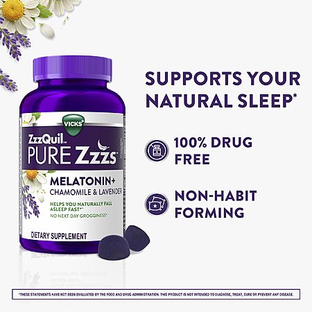 $13.80: ZzzQuil PURE Zzzs Melatonin Gummies, Sleep Aid, Melatonin 2mg, with Chamomile & Lavender, Wildberry Vanilla Flavored, 72 Sleep Gummies