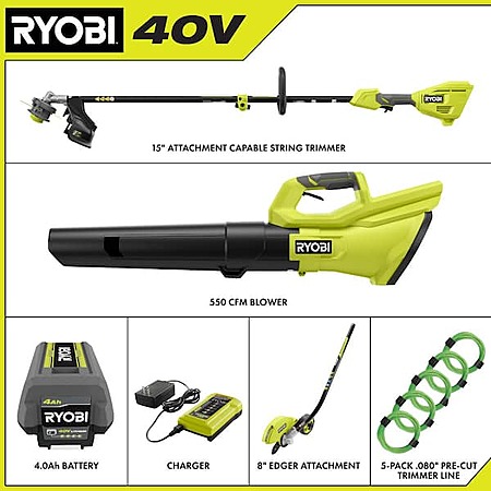 $249: RYOBI 40V Cordless Attachment Capable String Trimmer, 550 CFM Blower, Edger &. 080 Pre-Cut Line w/ 4.0 Ah Battery & Charger at HomeDepot