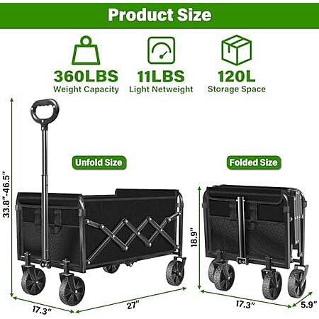Model: Wagons Carts Foldable, Collapsible Wagon Cart Foldable with All-Terrain Wheels, Folding Wagon for Beach Camp Sports Garden, Lightweight Portable/360 LBS/2025 New (Black)