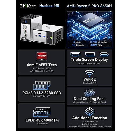 GMKtec M8 Mini PC: Ryzen 5 PRO 6650H, 16GB LPDDR5, 512GB SSD, Oculink, USB4 $359.99