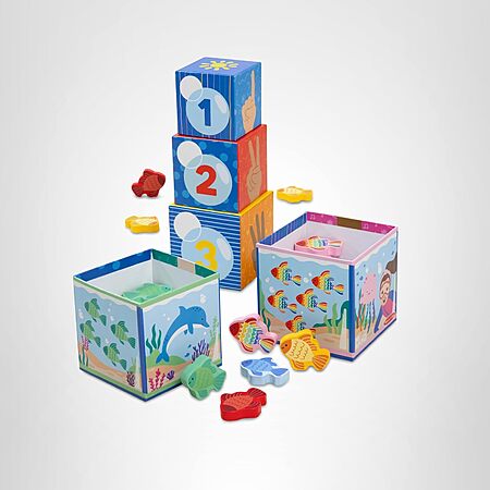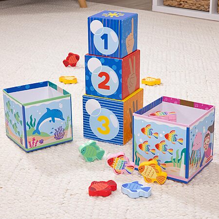 - OFFICIAL MS. RACHEL TOYS: Stack or nest 5 sturdy numbered cardboard blocks themed after Ms. Rachel's popular "Bubble, Bubble, Pop!" song, and practice counting, matching, and sorting 15 colorful wooden fish