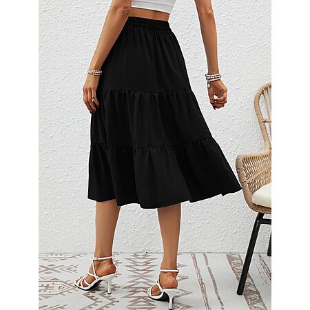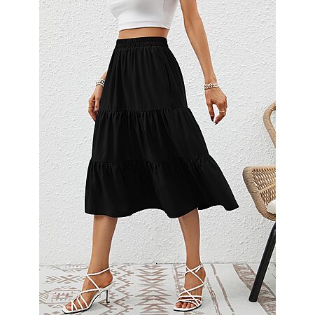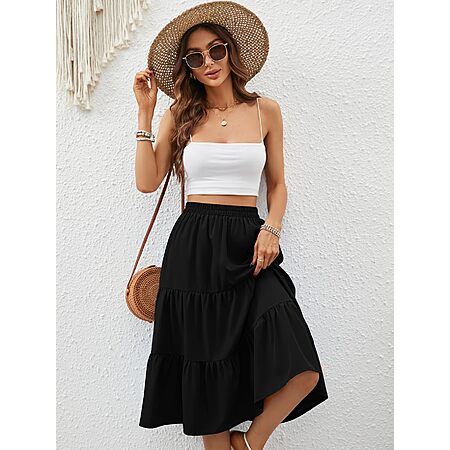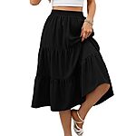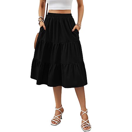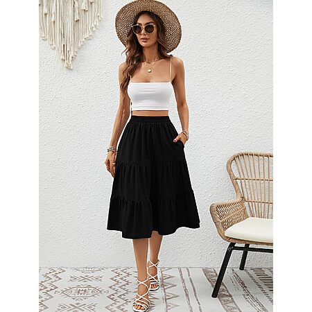 Lyrur Skirts for Women Elastic Waist Aline Tiered Ruffle Casual Beach Summer Midi Black Skirt with Pockets(S,9193-Black) $7.45