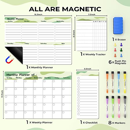 - Sturdy Markless Packaging: monthly planner (16.3" x 11.7"), weekly planner (16.3" x 11.7"), checklist (5.5" x 11.7"), weekly tracker (7.5" x 8.3"), 8 colored markers, 6 push pin magnets, and an eraser. All are magnetic and suitable for most refrigerators and smooth metal surfaces