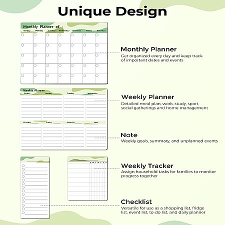 - Innovative Design: Available in three styles—camouflage green, leafy yellow, and mountain gray—perfectly blending with any modern home. The new weekly tracking whiteboard helps organize tasks and monitor children's chores, fostering good habits. Upgraded monthly and weekly calendars feature larger writing spaces for better planning. Checklist with a flexible blank space at the top for various uses